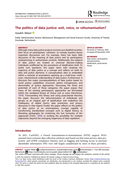 "Although many data justice projects envision just datafied societies, their focus on participatory ‘solutions’ to remedy injustice leaves important discussions out. For example, there has been little discussion of the meaning of data justice and its participatory underpinnings in authoritarian contexts. Additionally, the subjects of data justice are treated as universal decision-making individuals unaffected by the procedures of datafication itself. To tackle such questions, this paper starts with studying the trajectory of data justice as a concept and reflects on both its data and justice elements. It conceptualises data as embedded within a network of associations opening up a multi-level, multiactor, intersectional understanding of data justice. Furthermore, it discusses five major conceptualisations of data justice based on social justice, capabilities, structural, sphere transgression, and abnormality of justice approaches. Discussing the limits and potentials of each of these categories, the paper argues that many of the existing participatory approaches are formulated within the neoliberal binary of choice: exit or voice (Hirschman, 1970). Transcending this binary and using postcolonial theories, the paper discusses the dehumanisation of individuals and groups as an integral part of datafication and underlines the inadequacy of digital harms, data protection, and privacy discourses in that regard. Finally, the paper reflects on the politics of data justice as an emancipatory concept capable of transforming standardised concepts such as digital literacy to liberating pedagogies for reclaiming the lost humanity of the oppressed (Freire, 1970) or evoking the possibility for multiple trajectories beyond the emerging hegemony of data capitalism." (Abstract)