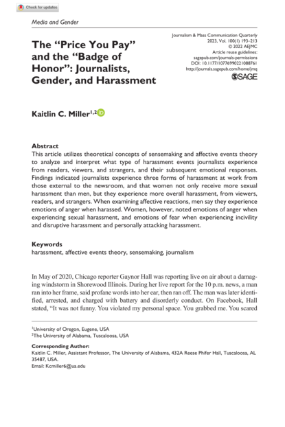 "This article utilizes theoretical concepts of sensemaking and affective events theory to analyze and interpret what type of harassment events journalists experience from readers, viewers, and strangers, and their subsequent emotional responses. Findings indicated journalists experience three forms of harassment at work from those external to the newsroom, and that women not only receive more sexual harassment than men, but they experience more overall harassment, from viewers, readers, and strangers. When examining affective reactions, men say they experience emotions of anger when harassed. Women, however, noted emotions of anger when experiencing sexual harassment, and emotions of fear when experiencing incivility and disruptive harassment and personally attacking harassment." (Abstract)