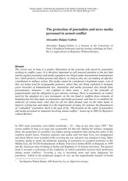 "The recent war in Iraq is a perfect illustration of the growing risks faced by journalists working in conflict zones. It is therefore important to call renewed attention to the fact that attacks against journalists and media equipment are illegal under international humanitarian law, which protects civilian persons and objects, as long as they are not making an effective contribution to military action. The media cannot be considered a legitimate target, even if they are being used for propaganda purposes, unless they are being exploited to instigate grave breaches of humanitarian law. Journalists and media personnel also benefit from precautionary measures – not confined to them alone – such as the principle of proportionality and the obligation to give advance warning. There is nonetheless an evident need for the adoption of a new instrument, on the one hand to reaffirm those elements of humanitarian law that apply to journalists and media personnel, and thus to re-establish the authority of certain basic rules that are all too often flouted, and, on the other hand, to improve existing law and adapt it to the requirements of today, for instance the phenomenon of “embedded” journalists. Such is the goal of the “Declaration on the safety of journalists and media personnel in situations involving armed conflict,” drawn up in 2003 by Reporters without Borders." (Abstract)
