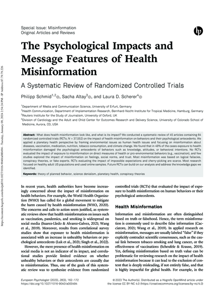 "What does health misinformation look like, and what is its impact? We conducted a systematic review of 45 articles containing 64 randomized controlled trials (RCTs; N = 37,552) on the impact of health misinformation on behaviors and their psychological antecedents. We applied a planetary health perspective by framing environmental issues as human health issues and focusing on misinformation about diseases, vaccination, medication, nutrition, tobacco consumption, and climate change. We found that in 49% of the cases exposure to health misinformation damaged the psychological antecedents of behaviors such as knowledge, attitudes, or behavioral intentions. No RCTs evaluated the impact of exposure to misinformation on direct measures of health or pro-environmental behaviors (e.g., vaccination), and few studies explored the impact of misinformation on feelings, social norms, and trust. Most misinformation was based on logical fallacies, conspiracy theories, or fake experts. RCTs evaluating the impact of impossible expectations and cherry-picking are scarce. Most research focused on healthy adult US populations and used online samples. Future RCTs can build on our analysis and address the knowledge gaps we identified." (Abstract)