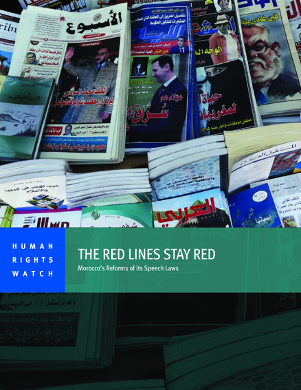 "Morocco’s 2015 Press Code eliminates prison as a punishment for speech offenses. This, on its face, represents progress for freedom of expression in a country where journalists and ordinary citizens have been locked up for “insulting” the king, questioning Morocco’s claim over Western Sahara, or rapping about police corruption. The Red Lines Stay Red: Morocco’s Reform of its Speech Laws analyzes the laws governing speech offenses in Morocco and finds that the recent overhaul falls well short of securing freedom of speech as guaranteed by international conventions and Morocco’s own 2011 constitution. Imprisonment as punishment for crossing Morocco’s famous “red lines” – causing harm to Islam, “territorial integrity,” the institution of the monarchy, or the person of the king – is alive and well. While the new press code punishes “red line” offenses only with the suspension of publications, judges can, thanks to new provisions of the penal code, still hand down prison sentences for these offenses. In addition, the penal code continues to mandate prison sentences for other speech offenses such as “insulting” state institutions or state agents, and broadly defined notions of “praising terrorism,” “casting discredit on judicial decisions,” and “inciting hatred or discrimination." (Back cover)