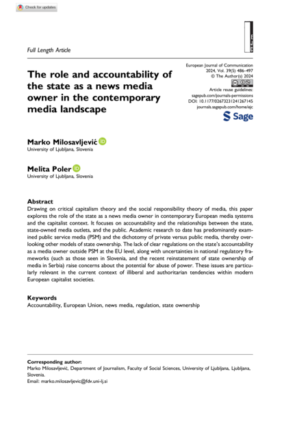 "Drawing on critical capitalism theory and the social responsibility theory of media, this paper explores the role of the state as a news media owner in contemporary European media systems and the capitalist context. It focuses on accountability and the relationships between the state, state-owned media outlets, and the public. Academic research to date has predominantly examined public service media (PSM) and the dichotomy of private versus public media, thereby overlooking other models of state ownership. The lack of clear regulations on the state’s accountability as a media owner outside PSM at the EU level, along with uncertainties in national regulatory frameworks (such as those seen in Slovenia, and the recent reinstatement of state ownership of media in Serbia) raise concerns about the potential for abuse of power. These issues are particularly relevant in the current context of illiberal and authoritarian tendencies within modern European capitalist societies." (Abstract)