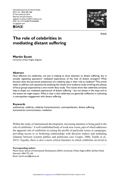 "How effective are celebrities, not just in helping to draw attention to distant suffering, but in actually regulating spectators’ mediated experiences of the lives of distant strangers? What function does the perceived authenticity of a celebrity play in their role as mediator? This article seeks to address such questions by analysing the results of an audience study involving two phases of focus groups separated by a two-month diary study. The results show that celebrities certainly help to shape our mediated experiences of distant suffering – but not always in the ways and to the extent we might expect. What is clear is that celebrities are generally ineffective in cultivating a cosmopolitan engagement with distant suffering." (Abstract)