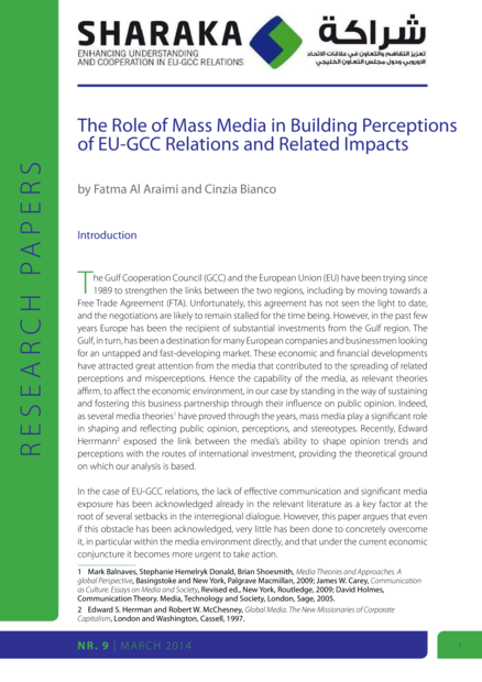 "This paper addresses the way the Gulf Cooperation Council (GCC) region is presented in the EU media and vice versa, in a time in which perceptions and misperceptions could influence negatively the consistent flows of international investments that are instrumental to the diversification of the Gulf economies as well as to the ailing of the European ones. The authors compare the most common stereotypes structuring the public discourse with the views of some journalists from Europe and the GCC countries gathered through a small but targeted survey and a subsequent focus group. The findings show a limited degree of familiarity and interaction, but at the same time having a sort of latent interest, especially with regard to politics and economics. They also uncover a different degree of technical skills and underscore a different level of diversification in sources. In the conclusion, the authors develop some policy-oriented recommendations to bridge this communication gap among media members and foster more accurate and comprehensive reporting, oriented at preparing the ground for mutually beneficial interregional cooperation." (www.sharaka.eu)