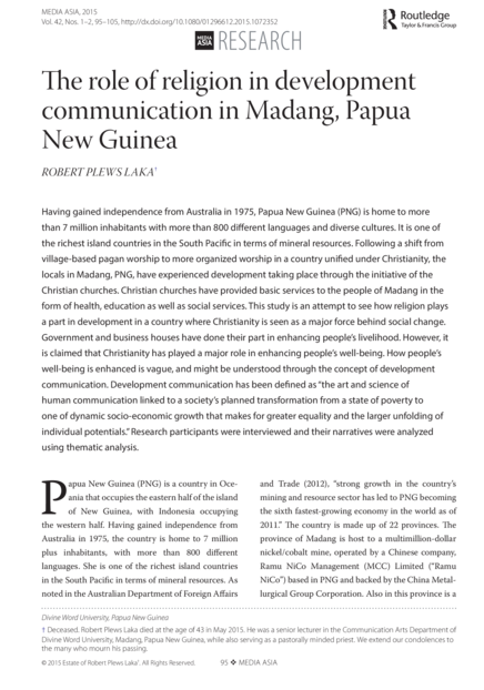 "This study is an attempt to see how religion plays a part in development in a country where Christianity is seen as a major force behind social change. Government and business houses have done their part in enhancing people’s livelihood. However, it is claimed that Christianity has played a major role in enhancing people’s well-being. How people’s well-being is enhanced is vague, and might be understood through the concept of development communication. Development communication has been defined as “the art and science of human communication linked to a society’s planned transformation from a state of poverty to one of dynamic socio-economic growth that makes for greater equality and the larger unfolding of individual potentials.” Research participants were interviewed and their narratives were analyzed using thematic analysis." (Abstract)