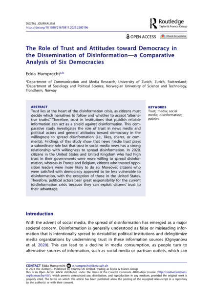 "Trust lies at the heart of the disinformation crisis, as citizens must decide which narratives to follow and whether to accept “alternative truths.” Therefore, trust in institutions that publish reliable information can act as a shield against disinformation. This comparative study investigates the role of trust in news media and political actors and general attitudes toward democracy in the willingness to spread disinformation (i.e., likes, shares, or comments). Findings of this study show that news media trust plays a subordinate role but that trust in social media news has a strong relationship with willingness to spread disinformation. In 2020, citizens in the United States and United Kingdom who had high trust in their governments were more willing to spread disinformation, whereas in France and Belgium, citizens who trusted opposition leaders were more likely to do so. Moreover, citizens who were satisfied with democracy appeared to be less vulnerable to disinformation, with the exception of those in the United States. Therefore, political actors bear great responsibility for the current (dis)information crisis because they can exploit citizens’ trust to their advantage." (Abstract)