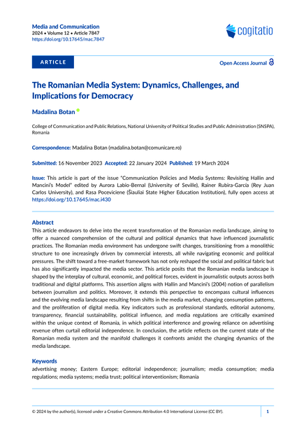 "This article endeavors to delve into the recent transformation of the Romanian media landscape, aiming to offer a nuanced comprehension of the cultural and political dynamics that have influenced journalistic practices. The Romanian media environment has undergone swift changes, transitioning from a monolithic structure to one increasingly driven by commercial interests, all while navigating economic and political pressures. The shift toward a free?market framework has not only reshaped the social and political fabric but has also significantly impacted the media sector. This article posits that the Romanian media landscape is shaped by the interplay of cultural, economic, and political forces, evident in journalistic outputs across both traditional and digital platforms. This assertion aligns with Hallin and Mancini's (2004) notion of parallelism between journalism and politics. Moreover, it extends this perspective to encompass cultural influences and the evolving media landscape resulting from shifts in the media market, changing consumption patterns, and the proliferation of digital media. Key indicators such as professional standards, editorial autonomy, transparency, financial sustainability, political influence, and media regulations are critically examined within the unique context of Romania, in which political interference and growing reliance on advertising revenue often curtail editorial independence. In conclusion, the article reflects on the current state of the Romanian media system and the manifold challenges it confronts amidst the changing dynamics of the media landscape." (Abstract)