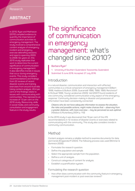 "In 2010, Ryan and Matheson (2010) compiled evidence to quantify the importance of communication activities to emergency management. The study involved a comprehensive content analysis of emergency incident and emergency exercise debriefing sessions and reports spanning 2003 to 2008. Six years on, this 2015 study replicates that work to determine the current significance of communication in emergency management. It also identifies trends in issues that occur during emergency events. This study considers recommendations and findings from 22 reviews of recent disaster events and training exercises from around Australia. Using content analysis, 20.4 per cent of the findings relate to issues with communicating with communities. This represents an increase of 1.3 per cent on the 2010 study. Resourcing, skills in social media, and community consultation and engagement feature in the study results". (Abstract)