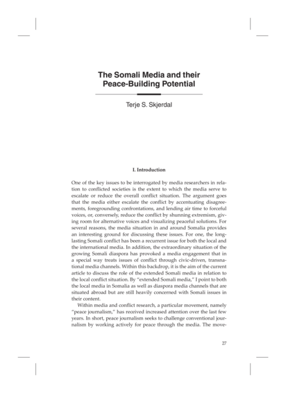 Within media and conflict research, a particular movement, namely “peace journalism,” has received increased attention over the last few years. In short, peace journalism seeks to challenge conventional journalism by working actively for peace through the media. The movement has gained momentum as a result of criticism raised against conventional media operations in the coverage of the so-called global war on terror, a critique that echoes several decades of disappointment with the global media and their coverage of national and international conflicts. Against this backdrop, peace journalism claims to be an alternative to the traditionally conflict-oriented news paradigm. Thus, it is necessary in this article firstly to introduce peace journalism and how the concept challenges conventional journalism in theory and practice. Then, secondly, I will discuss the functions of the extended Somali media environment from a peace and conflict perspective. Since both the diaspora media and local media channels in Somalia may be seen as potent proponents of peace journalism, the article aims to use these media forms as entry points to evaluate some of the key tenets of peace journalism. On the basis of this discussion, the article will conclude with some critical remarks about the peace journalism ideology on the level of principle." (Introduction)