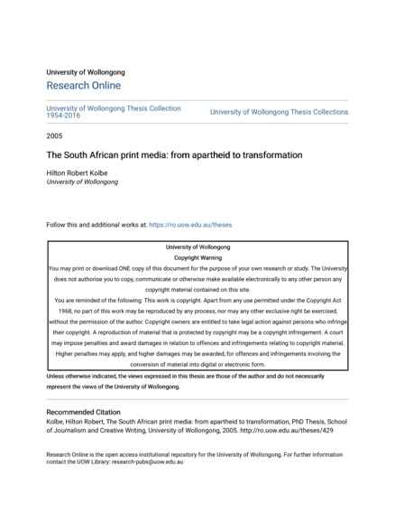 "This thesis considers the role of the mainstream South African print media in perpetuating discrimination during the years of legalised racial discrimination – commonly known as apartheid – from when the Herenigde Nationale Party took power in May 1948 with an unprecedented 28-seat swing under the leadership of 74-year-old Dr Daniel F. Malan until it was replaced by the African National Congress, black-dominated unity government in April, 1994. Against an historical background, it focuses on the agenda and efforts of the mainstream metropolitan print media during the apartheid era, the build-up to the first nonracial elections, and the media’s role in the immediate post-apartheid era." (Abstract, page 5)