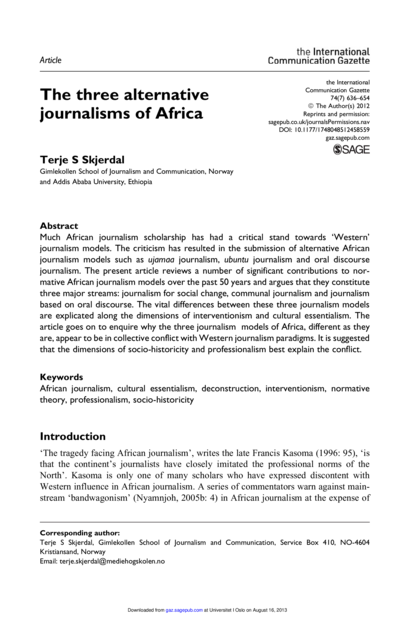 "Much African journalism scholarship has had a critical stand towards ‘Western’ journalism models. The criticism has resulted in the submission of alternative African journalism models such as ujamaa journalism, ubuntu journalism and oral discourse journalism. The present article reviews a number of significant contributions to normative African journalism models over the past 50 years and argues that they constitute three major streams: journalism for social change, communal journalism and journalism based on oral discourse. The vital differences between these three journalism models are explicated along the dimensions of interventionism and cultural essentialism. The article goes on to enquire why the three journalism models of Africa, different as they are, appear to be in collective conflict with Western journalism paradigms. It is suggested that the dimensions of socio-historicity and professionalism best explain the conflict." (Abstract)