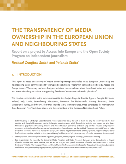 "Despite the importance of media ownership transparency for both the individual and the state, only two of the surveyed countries—Italy and Romania—address media transparency directly in their constitutions but in both cases the focus is on transparency of fi nancial sources not ownership. In the Turkish Constitution the state is empowered to require information as a precondition to publication. None of these constitutions therefore impose an express positive obligation on the state to ensure that the public has access to information on media ownership. Although the Constitution of Norway does not expressly refer to media ownership transparency, Norwegian media ownership rules, which do provide for ownership transparency, refer back to the provisions on freedom of expression in article 100 of the Constitution. These impose on the state a positive duty to create conditions that “facilitate open and enlightened public discourse”, thus underlining the link between freedom of expression and media ownership transparency." (Key findings, page 3)
