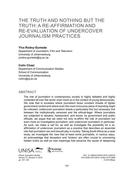 "The role of journalism in contemporary society is highly debated and highly contested all over the world, even more so in the context of young democracies. We note that in societies where journalism faces constant threats of tighter government control and where even the most innocuous piece of reporting might be criticised, undercover journalism treads a particularly thin but necessary line between the institutionally censored and the ethical-legal. Where journalists are subjected to rebukes, harassment, and worse, by government and public officials, we argue that we need not only re-affirm the role of journalism but even more so investigative journalism, and undercover journalism in particular. As such, we make a call for, as well as investigate the possibility for a reaffirmation of undercover journalism as a practice that describes an essential role that journalism can and should play in society. Taking South Africa as a case study, we investigate the view that at least some journalists, in various ways, do acknowledge that deception and ‘trickery’ are often crucial to uncovering hidden truths as well as new meanings that advance the cause of deepening democracy." (Abstract)