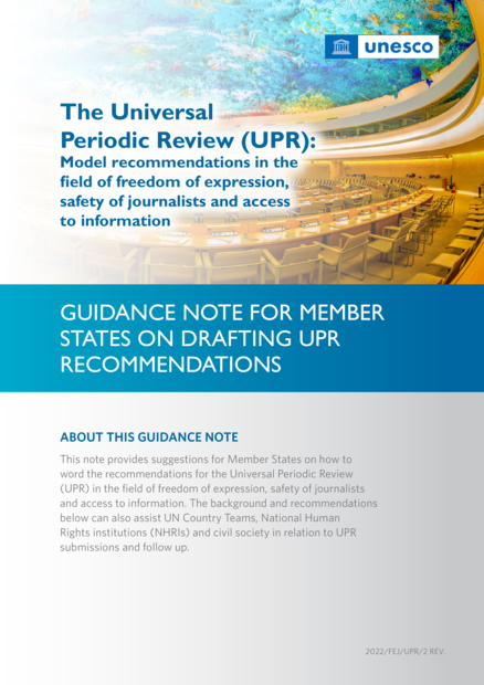 "This note provides suggestions for Member States on how to word the recommendations for the Universal Periodic Review (UPR) in the field of freedom of expression, safety of journalists and access to information. The background and recommendations below can also assist UN Country Teams, National Human Rights institutions (NHRIs) and civil society in relation to UPR submissions and follow up." (About this guidance note, page 1)