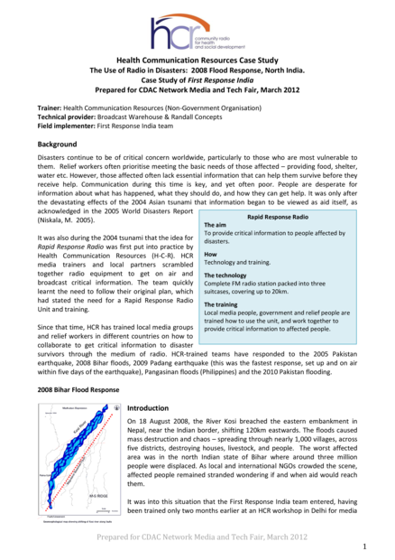 "Since the Bihar flooding, First Response India has gone on to train other teams in disaster radio response. Its aim is to equip other teams across India with the skills needed to improve collaboration and communication with people affected by crisis. Radio can also play a key role in other phases of the disaster. This was demonstrated in the 2005 Pakistan earthquake where radio was used in a variety of ways during the rehabilitation stage. Broadcasts included interviews with experts on stress management, medical treatment and dealing with after shocks. Community members spoke on tolerance, promoting dialogue (following outbreaks of violence in the community). Radio also has a role to play in mitigation and in reducing communities’ vulnerabilities to disasters. This is part of Feba’s community radio strategy. Feba has provided two rural community stations in Nepal with suitcase studios and training, which they use for community based programming – including health, sanitation, governance, rights, local music and dialogue. Effective communication and information flow has the potential to transform communities and save lives. In the disaster context, this potential can only be realized if accurate and timely information is combined with effective communication at all stages of the disasters and between all players. In the right hands, radio can be a powerful tool to help this process. It can provide a voice and a platform for the people who, ironically, are often not included or consulted in the humanitarian response – the affected community." (Conclusion, page 3)