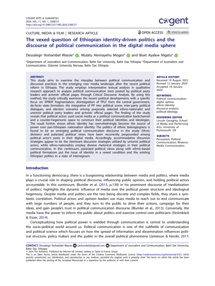 "This study aims to examine the interplay between political communication and discursive practices in the emerging new media landscape after the recent political reform in Ethiopia. The study employs interpretative textual analysis in qualitative research approach to analyze political communication texts posted by political party leaders and activists’ official pages through Critical Discourse Analysis. By using this method, the study critically examines the recent political developments with a specific focus on: EPRDF fragmentation, disintegration of TPLF from the central government, de-facto state formation, the integration of PP into political scene, inter-party political dialogues, and election scenarios among purposely selected ethno-nationalist and unionist political party leaders and activists’ official pages. The finding of the study reveals that political actors used social media as a political communication backchannel and a counter-hegemonic space to construct their political identities and ideologies. The result further shows ethnic identity has overwhelmingly become the source of power over pan-Ethiopian nationalism identity. The politics of ethnic belongingness is found to be an emerging political communication discourse in the study. Ethnic divisions and polarized political views have been recurrently propounded among political actor’s posts in their digital media. Accordingly, accommodative discursive strategies appear to be the dominant discursive strategies utilized by unionist political actors, while ethno-nationalists employ divisive rhetorical strategies in their political communication. In this continuum, polarized political views along with ethnic-based political formations put the issue of identity in a vexed condition and the existing Ethiopian politics in a state of interregnum." (Abstract)