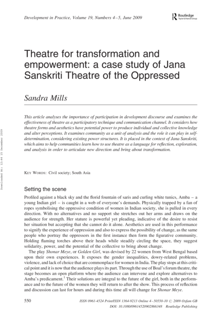 "This article analyses the importance of participation in development discourse and examines the effectiveness of theatre as a participatory technique and communication channel. It considers how theatre forms and aesthetics have potential power to produce individual and collective knowledge and alter perceptions. It examines community as a unit of analysis and the role it can play in selfdetermination, considering existing power structures. It is placed in the context of Jana Sanskriti, which aims to help communities learn how to use theatre as a language for reflection, exploration, and analysis in order to articulate new direction and bring about transformation." (Abstract)