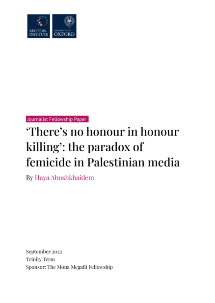 "The significance of our work became obvious to me in that courtroom. Stories of femicide do make headlines in Palestinian news, but rarely top the public agenda. If journalists made the same fuss every time a woman was attacked or murdered, would society look different? Why don't all women get the same public and media attention and outrage as Israa?" (Page 3)
