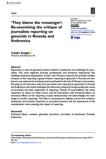 "Reporting on cases of genocide presents distinct complexities and challenges for journalists, who must negotiate practical, professional, and emotional experiences that challenge traditional expectations of their role. Previous research has provided strident critiques of this reporting, arguing Western reporting of genocide in Rwanda and Srebrenica was reductionist and biased and contributed to the lack of Western intervention. Drawing on 22 interviews with print journalists who reported on genocides in Rwanda and Srebrenica, this article challenges this dominant critique by foregrounding the voices of journalists and their experience of reporting. Themes of inaccessibility, the moral imperative to report on these events, and the intersection with emotional labour on emotional effects of this reporting crucially demonstrates and acknowledges the challenges of conflict reporting. This adds to contemporary debates around how emotion, attachment and morality intertwine in journalism practice and the importance of this consideration when assessing the impact of reporting." (Abstract)