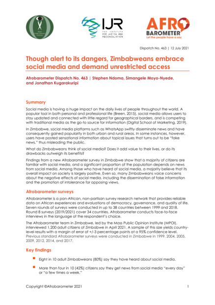 "Eight in 10 adult Zimbabweans (80%) say they have heard about social media. More than four in 10 (42%) citizens say they get news from social media “every day” or “a few times a week.” Among those who have heard about social media the vast majority (91%) say social media helps keep people informed about current events. Half (49%) believe that social media helps people have more impact on political processes. But seven in 10 (71%) also see social media as making people more likely to believe false information, and 44% say it makes people more intolerant of opposing views. Overall, six in 10 (61%) say the effects of social media on society are “somewhat positive” or “very positive.” Two-thirds (65%) of Zimbabweans say social media and the Internet help make people more informed and active citizens, and hence unrestricted access to these platforms must be protected." (Key findings, page 1-2)