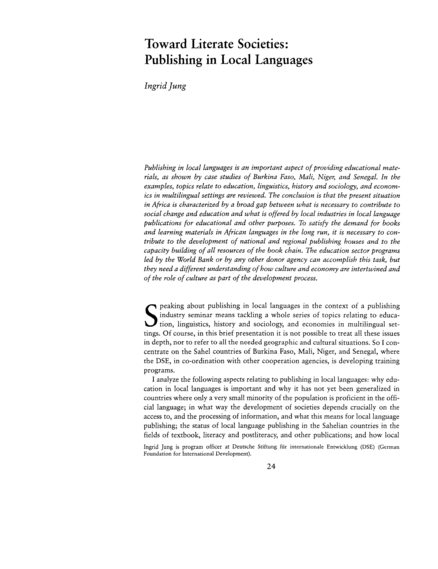 "An analysis of publishing in African languages in four countries of francophone Africa (Burkina Faso, Mali, Niger, and Senegal), where the Deutsche Stiftung für Internationale Entwicklung (German Foundation for International Development, now part of GIZ), in cooperation with other agencies, has been developing training programmes for textbook authors to create local capacity in the writing of textbooks for local language teaching. It reports about the main lessons learnt during the execution of the programme. Ingrid Jung argues that the development of societies depends crucially on the access to and the written processing of information, and discusses what this means for local language publishing. She concludes that the present situation in Africa is characterized by a broad gap between what is necessary to contribute to social change and education, and what local book industries offer in the field of local language publications for educational and other purposes. “To satisfy the demand for books and learning materials in African languages in the long run, it is necessary to contribute to the development of national and regional publishing houses and to the capacity building of all links of the book chain." (Hans M. Zell, Publishing, Books & Reading in Sub-Saharan Africa, 3d ed. 2008, nr. 2108)