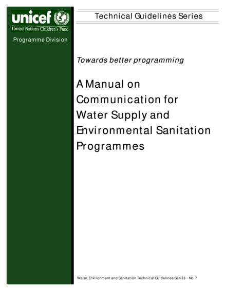 "This manual provides a wide range of the latest know how about social change with regard to water supply, environment and sanitation programmes. The focus is on sound principles in programme communication. It intends to provide guidance on how to incorporate adequate communication and behaviour change approaches in water and environmental sanitation programmes. The emphasis lies on the development of practices by individuals and communities that will be sustainable throughout a lifetime." (https://www.ircwash.org/resources)