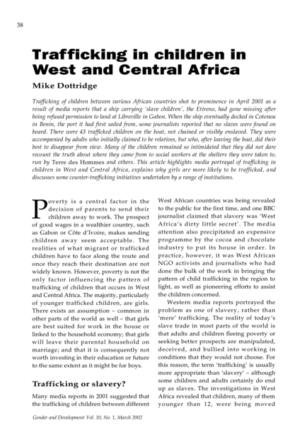 "Trafficking of children between various African countries shot to prominence in April 2001 as a result of media reports that a ship carrying ‘slave children’, the Etireno, had gone missing after being refused permission to land at Libreville in Gabon. When the ship eventually docked in Cotonou in Benin, the port it had first sailed from, some journalists reported that no slaves were found on board. There were 43 trafficked children on the boat, not chained or visibly enslaved. They were accompanied by adults who initially claimed to be relatives, but who, after leaving the boat, did their best to disappear from view. Many of the children remained so intimidated that they did not dare recount the truth about where they came from to social workers at the shelters they were taken to, run by Terre des Hommes and others. This article highlights media portrayal of trafficking in children in West and Central Africa, explains why girls are more likely to be trafficked, and discusses some counter-trafficking initiatives undertaken by a range of institutions." (Abstract)