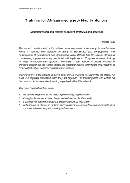 Training for African Media Provided by Donors: Summary Report and Resumé of Current Strategies and Practices