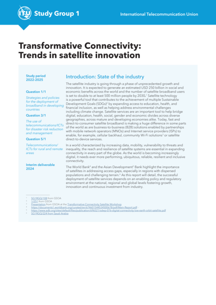 "Satellite technology represents a transformative solution to global connectivity challenges, particularly in developing countries and in rural and remote regions. By expanding connectivity in these historically underserved areas, satellite networks are bridging the digital divide and driving sustainable development through improved access to health care, education, employment and financial inclusion. The continued success and growth of satellite services hinges on supportive policy and regulatory frameworks and enhanced collaboration between governments, industry and regulators. Clear regulatory environments, investment incentives and strengthened partnerships between satellite operators and terrestrial service providers will be crucial in maximizing the transformative benefits of satellite technology and in fostering affordable, resilient and meaningful universal connectivity for all." (Conclusion)