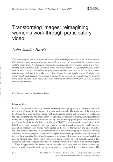 "This ethnographic study of a participatory video workshop conducted with rural women in Fiji observed how communities engage with processes of production for empowerment, and the implications for dialogue, community building, and representation within Fiji’s fragmented multicultural society. The study found that rural women in Fiji integrate local norms and practices in the production of programme content, and use social capital – their relationships and social networks – as a key element in video production to highlight community needs and linkages. The content produced by the women gave significance to women’s work, their abilities, their skills, and their potential as income producers, as well as their empowering networks." (Abstract)