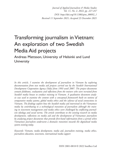"In this article, I examine the development of journalism in Vietnam by exploring documentation from two media aid projects carried out by the Swedish International Development Cooperation Agency (Sida) from 1993 until 2007. The project documents contain fieldnotes, evaluations and reflections from the trainers who were recruited from Swedish media houses to conduct training in Vietnam. A qualitative document analysis was used to examine the content with a conceptual framework built on notions of comparative media systems, global media ethics and the salience of social connections in Vietnam. The findings explore how the Swedish media aid intervened in the Vietnamese media by contributing to a technological transition of journalism although the training in newsroom management and media ethics were challenged by conflicting journalism ideology and social norms. The article contributes to the existing research on media development, reflections on media aid and the development of Vietnamese journalism by analysing project documents that provide first-hand information from a period when Vietnamese journalism underwent a dramatic transition towards the digitalized media system existing today." (Abstract)