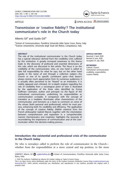 "The role of the institutional communicator in the Church today has a special relevance derived from the credibility crisis suffered by this institution. A greatly increased awareness to this theme leads to the discovery of profound and essential dimensions of this role, which are discussed in this article. The focus is on the credibility of the communicator, who, on one hand is called to take full responsibility for what he says, but on the other hand speaks in the name of and through a collective subject—the Church or one of its specific constituent parts—that doesn’t always receive much appreciation from its numerous audiences; it is actually often perceived to be “biased” as an institution, it is widely opposed and criticized. An in-depth analysis regarding the role of credibility from a sociological point of view is illustrated by the application of the three roles identified by Erving Goffman—animator, author and principal—to the figure of the institutional communicator, underlining his responsibilities as communication co-leader. A comparison with the concept of translator as a mediator illuminates other characteristics of the communicator, and functions as a basis to comment on some of the virtues (both personal and professional), which he must possess, enhancing both his credibility and efficiency. The application of the concept of creative fidelity (fidélité créatrice) from the French philosopher Gabriel Marcel, together with the interrelation between comprehension and exposition in a comprehensible manner (hermeneutics and creativity), highlights the necessity of reconsidering the importance of communication and of the communicator within the decision-making process." (Abstract)