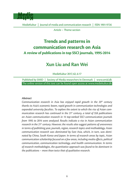 "To explore the extent to which the rise of Asian communication research has continued in the 21st century, a total of 558 publications on Asian communication research in 14 top-ranked SSCI communication journals from 1995 to 2014 were analyzed. Results indicate a rise in Asian communication research in the 21st century. However, the results also suggest patterns of unevenness in terms of publishing year, journals, region, research topics and methodology. Asian communication research was dominated by East Asia, which, in turn, was dominated by China, South Korea and Japan. In terms of research areas by topic, Asian communication scholarship focused on a few areas, including media eff ects, political communication, communication technology, and health communication. In terms of research methodologies, the quantitative approach was found to be dominant in the publications – more than twice that of qualitative research." (Abstract)