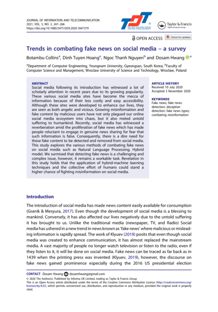 "This study explores the various methods of combating fake news on social media such as Natural Language Processing, Hybrid model. We surmised that detecting fake news is a challenging and complex issue, however, it remains a workable task. Revelation in this study holds that the application of hybrid-machine learning techniques and the collective effort of humans could stand a higher chance of fighting misinformation on social media." (Abstract)