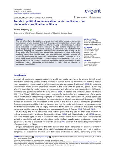 "The role of media in democratic governance is pivotal, yet its impact on democratic consolidation remains debated. This study investigates the relationship between radio activism and democratic consolidation in Ghana, focusing on the influence of political news production and communication strategies by radio stations. Employing a case study design and qualitative research approach, 23 informants were selected through purposive sampling for face-to-face semi-structured interviews. The findings of the study reveal that participatory and decentralized approaches to radio broadcasting, involving collaboration between radio staff and community members, enhance the conducive environment for democratic consolidation. However, challenges such as politicization and commercialization of political news content undermine public trust in radio broadcasting. The study concludes that stakeholder engagement in political news production fosters participatory communication on radio, thus contributing to democratic consolidation." (Abstract)