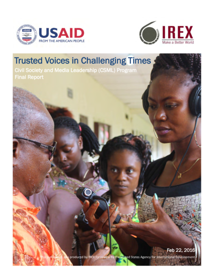"For over five and one-half years, the Civil Society and Media Leadership (CSML) Program, led by IREX in partnership with The Carter Center and Social Impact, contributed to building a more capable, collaborative, and agile civil society and media sector in Liberia. The CSML team provided intensive support including training, mentoring, small grants, and equipment to over 60 civil society organizations and 35 media outlets in 15 counties. IREX has distributed over $6 million in grants to civil society organizations to conduct advocacy, reconciliation, civic and voter education, Ebola awareness raising, and contribute to their own organizational development. Community radio stations have received a total of over $400K worth of equipment, including 19 transmitters. The Carter Center trained 3,500 chiefs, women, and youth to advance access to justice and resolve community disputes, and broadened awareness of Freedom of Information to over 15,000 Liberians across the seven original target counties. Beyond these outputs, CSML has contributed to true impact, fostering an improved and enhanced civil society and media sector. These accomplishments are a result of the collaborative effort of IREX and its wealth of partners both international and national who sought, together, to achieve the goal to “sustain peace in Liberia through greater inclusion, giving a voice to, informing and engaging Liberian citizens.” As a result, in part, of the CSML program, IREX’s civil society partners conduct advocacy that is more informed and less confrontational, engage the media as a key stakeholder, and have more productive strategies for engaging local and national government." (Executive summary)