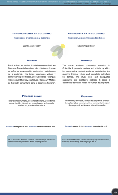 "En el artículo se analiza la televisión comunitaria en Colombia. Presenta las rutinas y los criterios con los que se define su programación, contenidos, participación de la audiencia, los temas recurrentes, valores y contravalores periodísticos. El estudio utiliza y triangula métodos cuantitativos y cualitativos. Plantea un “Modelo de televisión comunitaria para el desarrollo humano." (Resumen)