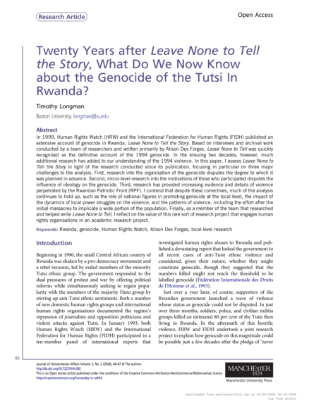 "In 1999, Human Rights Watch (HRW) and the International Federation for Human Rights (FIDH) published an extensive account of genocide in Rwanda, Leave None to Tell the Story. Based on interviews and archival work conducted by a team of researchers and written primarily by Alison Des Forges, Leave None to Tell was quickly recognised as the definitive account of the 1994 genocide. In the ensuing two decades, however, much additional research has added to our understanding of the 1994 violence. In this paper, I assess Leave None to Tell the Story in light of the research conducted since its publication, focusing in particular on three major challenges to the analysis. First, research into the organisation of the genocide disputes the degree to which it was planned in advance. Second, micro-level research into the motivations of those who participated disputes the influence of ideology on the genocide. Third, research has provided increasing evidence and details of violence perpetrated by the Rwandan Patriotic Front (RPF). I contend that despite these correctives, much of the analysis continues to hold up, such as the role of national figures in promoting genocide at the local level, the impact of the dynamics of local power struggles on the violence, and the patterns of violence, including the effort after the initial massacres to implicate a wide portion of the population. Finally, as a member of the team that researched and helped write Leave None to Tell, I reflect on the value of this rare sort of research project that engages human rights organisations in an academic research project." (Abstract)