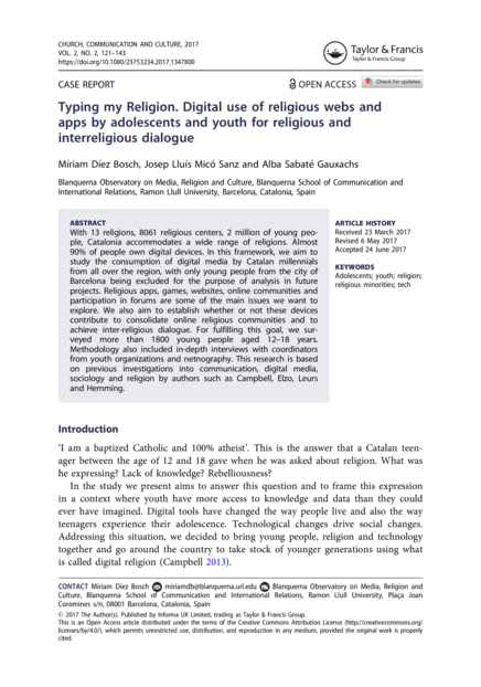 "With 13 religions, 8061 religious centers, 2 million of young people, Catalonia accommodates a wide range of religions. Almost 90% of people own digital devices. In this framework, we aim to study the consumption of digital media by Catalan millennials from all over the region, with only young people from the city of Barcelona being excluded for the purpose of analysis in future projects. Religious apps, games, websites, online communities and participation in forums are some of the main issues we want to explore. We also aim to establish whether or not these devices contribute to consolidate online religious communities and to achieve inter-religious dialogue. For fulfilling this goal, we surveyed more than 1800 young people aged 12–18 years. Methodology also included in-depth interviews with coordinators from youth organizations and netnography. This research is based on previous investigations into communication, digital media, sociology and religion by authors such as Campbell, Elzo, Leurs and Hemming." (Abstract)