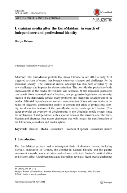 "The EuroMaidan protests that shook Ukraine in late 2013 to early 2014 triggered a chain of events that brought numerous changes and challenges for the Ukrainian society. The Ukrainian media landscape has also been affected by the new challenges and impetus for democratization. The post-Maidan period saw both, improvements in the media environment and setbacks. While Ukrainian journalists can benefit from increased media freedom, new progressive legislation and reinvigoration of the democratic debate, many problems still shape the development of the media. Editorial dependence on owners, concentration of mainstream media in the hands of oligarchs, deteriorating quality of content and crisis of professional identity are distinctive features of the post-Maidan media landscape in Ukraine. This paper provides an overview of developments in the Ukrainian media system since the declaration of independence with a special focus on the situation after the EuroMaidan and discusses four major challenges that will impact the transformation of the Ukrainian journalism and media sphere." (Abstract)