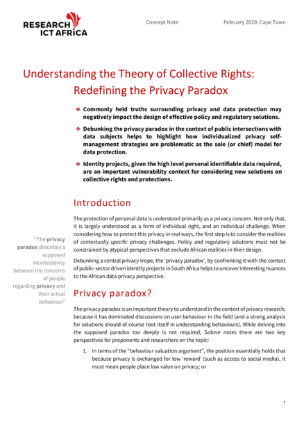"Commonly held truths surrounding privacy and data protection may negatively impact the design of effective policy and regulatory solutions. Debunking the privacy paradox in the context of public intersections with data subjects helps to highlight how individualized privacy self-management strategies are problematic as the sole (or chief) model for data protection. Identity projects, given the high level personal identifiable data required, are an important vulnerability context for considering new solutions on collective rights and protections." (Page 1)
