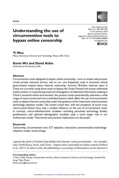 "Circumvention tools designed to bypass online censorship such as simple web proxies, virtual private network service, and so on are frequently used in countries whose governments impose heavy Internet censorship. Around 18 million Internet users in China are currently using those tools to bypass the Great Firewall and access unblocked online content. In a pioneering empirical investigation of unblocked information seeking in China's censored online environment, the present study systematically examines a wide range of macro-social and micro-individual factors which affect the use of circumvention tools to bypass Internet censorship under the guidance of the interactive communication technology adoption model. The results reveal that, with the exception of social trust, macro-social factors have only a modest influence on the use of circumvention tools. In contrast, micro-individual-level variables-including perceived technology fluidity, gratifications, and selected demographic variables-play a much larger role in our multivariate model. Theoretical and practical implications are discussed." (Abstract)