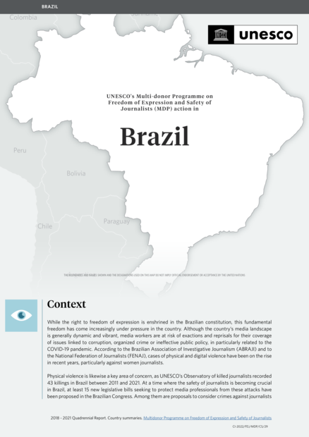 "[...] new legislation has been introduced that could have a detrimental effect on freedom of expression and access to information. This includes a “fake news” bill that was approved by the Senate in June 2020 and allows for the criminalization of certain online content, creates identification requirements for online platforms account holders, and obliges private-messaging apps to retain communications. In May 2021, a new bill replacing the National Security Act was introduced, which contains provisions criminalizing “mass misleading communication”, and lacks protection measures for investigative journalists. Brazil was therefore added as a target country under the MDP in October 2021 with the aim of enhancing the safety of journalists, building on past experiences in supporting media in the region. Actions notably build on support to ABRAJI from the Global Media Defence Fund, through which ABRAJI is developing a local mechanism to monitor and report on gender-based violence against women journalists. These first few months under the MDP served as an inception phase, during which planning advanced for activities in 2022 and 2023. Future actions will be aligned with the Hague Commitment to Increase the Safety of Journalists, to which Brazil is a signatory, and will come to reinforce the implementation of the UN Plan of Action on the Safety of Journalists and the Issue of Impunity." (Page 2)