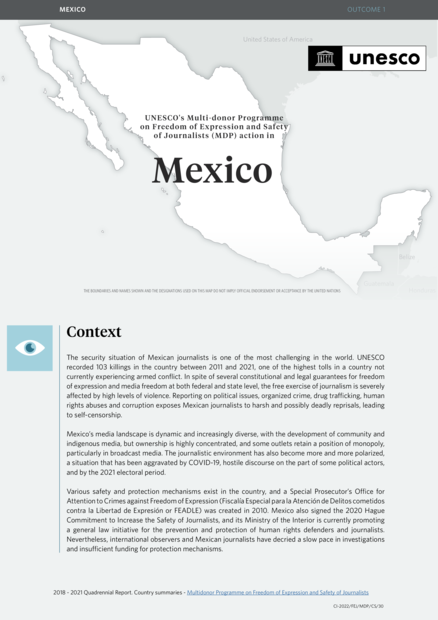 "On the occasion of the main conference commemorating the International Day to End Impunity for Crimes Against Journalists in 2019, which was held in Mexico City, the Spokesperson of the Mexican Presidency announced the Mexican government’s commitment to improve the protection of journalists, including by creating a Fund to support investigative journalism, which would be independently administered by UNESCO. This announcement came at a time where Mexican media were undergoing a crisis of sustainability generated by multiple factors, with many of them lacking the resources to provide reliable and quality information. However, this project had to be redesigned due to federal funds being redirected by the Mexican government to fight COVID-19. The project was therefore transformed in 2021 into a pilot programme to support investigative journalism in Mexico, which was made possible through the MDP. The pilot programme was also supported by seed-funding from the Mexican government along with additional funding from the National Institute for Transparency, Access to Information and Protection of Personal Data (INAI) and from the British Embassy in Mexico City." (Page 2)