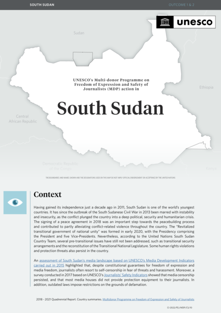 "The role of the media is critical for the future of South Sudan’s peacebuilding process, democracy and development. For this purpose, the Multi-Donor Programme has since 2018 supported the establishment of a safe and enabling environment for media through advocacy, awareness-raising, capacity-building and policy advice. This support builds on past actions undertaken by UNESCO, such as advocacy towards the adoption of Access to Information, Broadcasting Corporation and Media Authority laws, the set-up of a national monitoring and reporting mechanism on media violations through the Union of Journalists’ Media Observatory, and the production of safety training modules adopted by the University of Juba, the Media Development Institute and the Association for Media Development in South Sudan (AMDISS)." (Page 2)