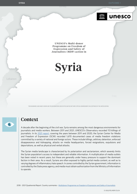 "A decade after the beginning of the civil war, Syria remains among the most dangerous environments for journalists and media workers. Between 2011 and 2021, UNESCO’s Observatory recorded 113 killings of journalists. In its 2021 report, covering the years between 2011 and 2020, the Syrian Center for Media and Freedom of Expression (SCM) recorded 1,670 documented cases of media freedom violations committed by a variety of national and foreign actors. These include killings, arbitrary detention, enforced disappearance and kidnapping, attacks on media headquarters, forced resignations, expulsions and deportations, as well as physical and verbal attacks.