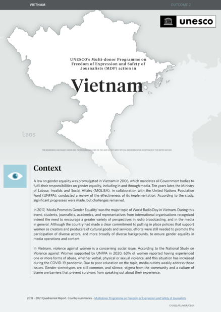 "UNESCO’s Hanoi office requested to be the first country implementing activities under Output 2, with the aim to help media institutions adopting policies on gender equality and raising awareness about gender-based violence in media. The first step consisted in the translation to Vietnamese of UNESCO’s main resource in this field: “Reporting on Violence against Women and Girls – A Handbook for Journalists’. Launched in 2019, this publication is a resource for media professionals with the intention to stimulate reflections on current reporting practices, provide information and promote and improve ethical coverage of gender-based violence. Under the MDP, UNESCO first targeted its action towards media institutions and journalists." (Page 2)