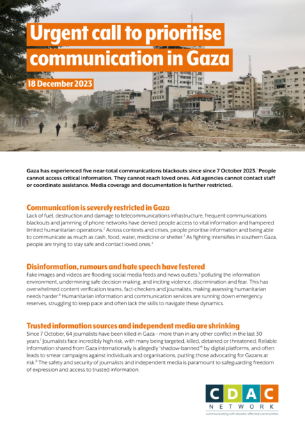 "Gaza has experienced five near-total communications blackouts since since 7 October 2023.1 People cannot access critical information. They cannot reach loved ones. Aid agencies cannot contact staff or coordinate assistance. Media coverage and documentation is further restricted." (Page 1)