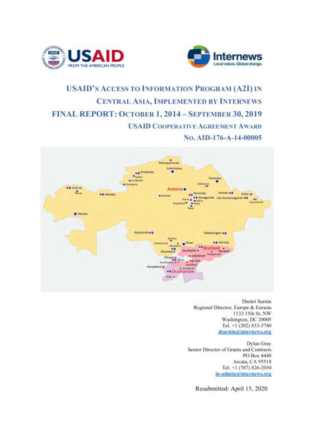 "The Access to Information Program (A2I) was a five-year Central Asia regional program funded by the United States Agency for International Development (USAID) and implemented by Internews under Cooperative Agreement 176-14-00005 from October 1, 2014 to September 30, 2019. During the first phase of the project (2014-2017), Internews implemented activities in Kazakhstan, Kyrgyzstan, and Tajikistan. The second phase focused on activities in Kazakhstan and Tajikistan only, while Kyrgyzstan’s media sector was supported with a new standalone project. The project aimed to strengthen the long-term sustainability of targeted media outlets, facilitate regional cooperation and conduct a number of activities designed to promote the modernization of newsrooms throughout the region, improving the financial viability of media, and increasing access to information that will keep government institutions accountable to citizens. A2I activities were implemented toward the following Project Goal: Increase citizen access to civically-relevant information in order to improve governance outcomes. From October 1, 2014 until September 30, 2017, the project was based around the following four objectives: Objective One: Increased regional cooperation to improve the competitiveness of non-state media outlets through content generation and sharing; Objective Two: Increased resilience of independent media to survive the impending treaty mandated shift to digital broadcasting across Central Asia; Objective Three: Professional standards for diverse and sustainable media voices; Objective Four: Improved legislative and policy environment. In 2017, USAID awarded Internews a two-year cost extension, under which the program goal remained the same, but the objectives were slightly adjusted to reflect the changing environment and needs of the media community in Central Asia." (Executive summary)