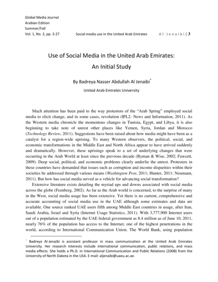 "The most popular types of social media in the UAE are generally the same as those used in other regions across the Middle East, North Africa, and beyond. These include social networks (Facebook), video-sharing sites (YouTube), and micro-blogging sites (Twitter), among others. UAE respondents were both generally skilled in the use of a variety of social media, and well aware of its potential ethical and practical limitations. It has served as a vital source and vehicle for news, information, business development, opinion sharing, cultural production, and entertainment. But residents were also well aware of its potential as a platform for making business and government practices more transparent, and its usefulness as a mobilizing platform for political change. Further research is needed to determine the larger impact of social media, particularly on UAE youth and women. Also, further research should be conducted to determine a more complete picture of its benefits, liabilities, and potential in an area that maintains one of world’s highest net migration rates. In the UAE, and perhaps the Gulf region at large, social media has established its place as an integral and interdependent actor in society." (Conclusion, page 22)